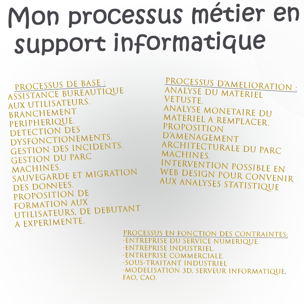 Mon service en support technique comprend plusieurs étape, en premier lieu la détection de la source, ensuite viens les premières résolutions, les tests concluent, puis la résolution final, une rigueur irréprochable afin de mener à bien le service. Au sein de mon service je peux vous installer est mettre en service un outil de gestion de parc machines, intégrant un outil ticketing, ainsi qu’établir la gestion logicielle et des systèmes. Les systèmes d’informations requiert plus que jamais une certaine aisance avec ces outils, une connaissance est un plus, une spécialisation est préférable. Une formation par niveau sur les logiciels, systèmes, paramétrage, infrastructure, serveur, peut être envisageable plus tard.