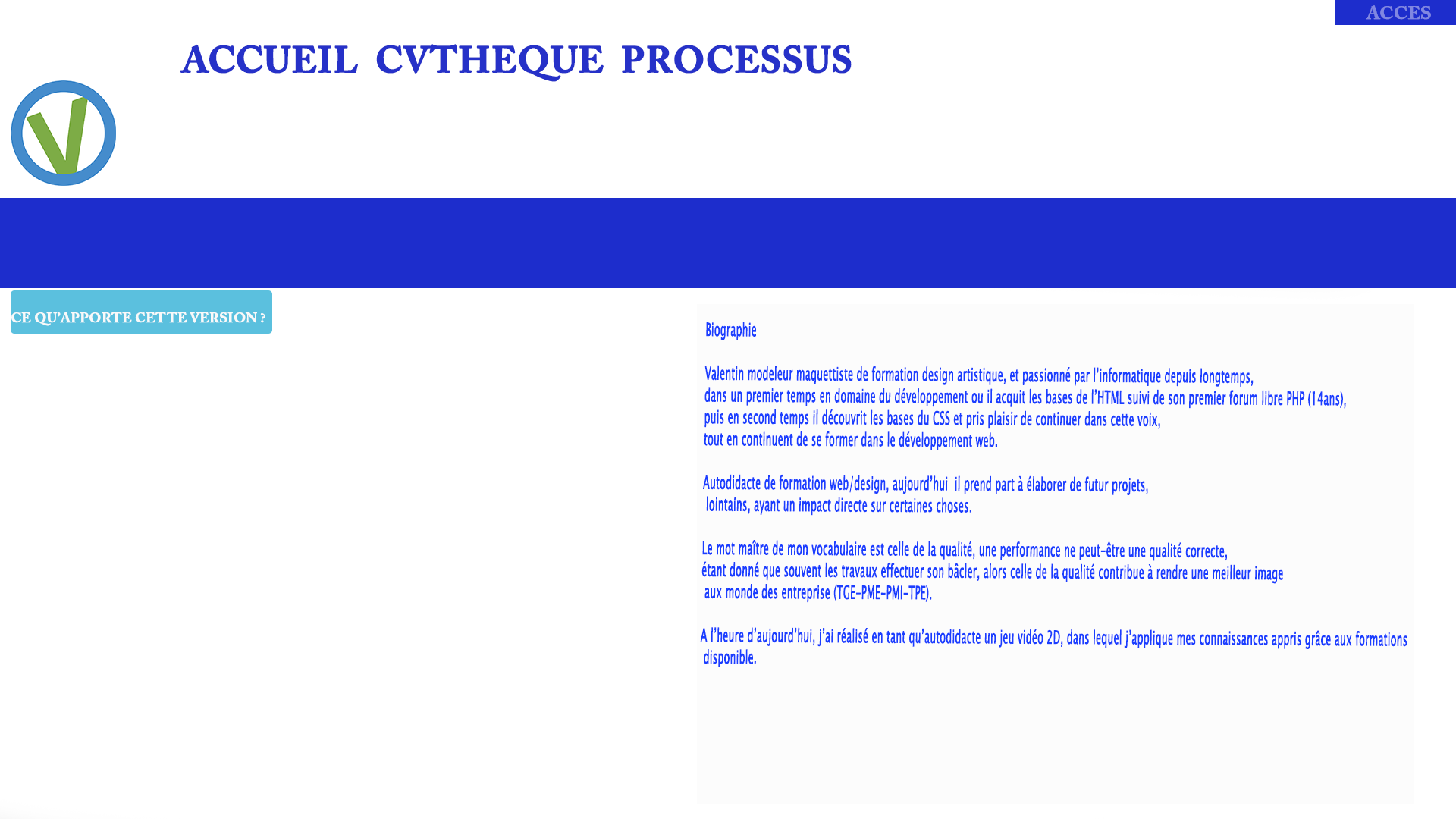 -Une refonte complète des écritures de l’index. -Un site désormais responsive, pour presque l’ensemble des mobiles. -Une présence d’un bas de page mieux positionné. -Un CV html entièrement créer et dessiné. -Un historique de version, désormais unifié, est uniquement pour la version en cours.